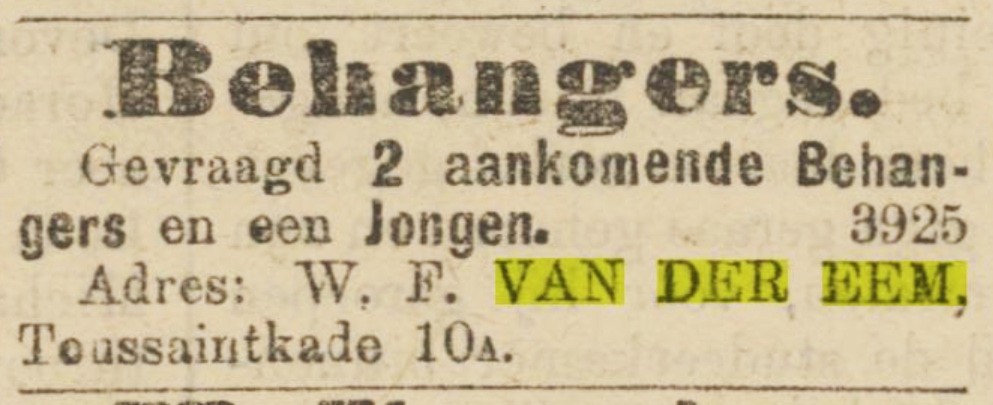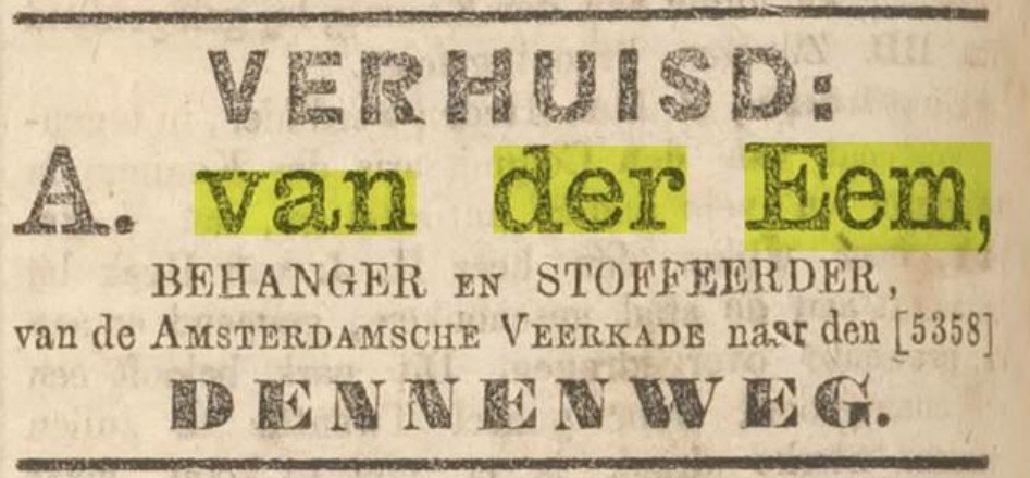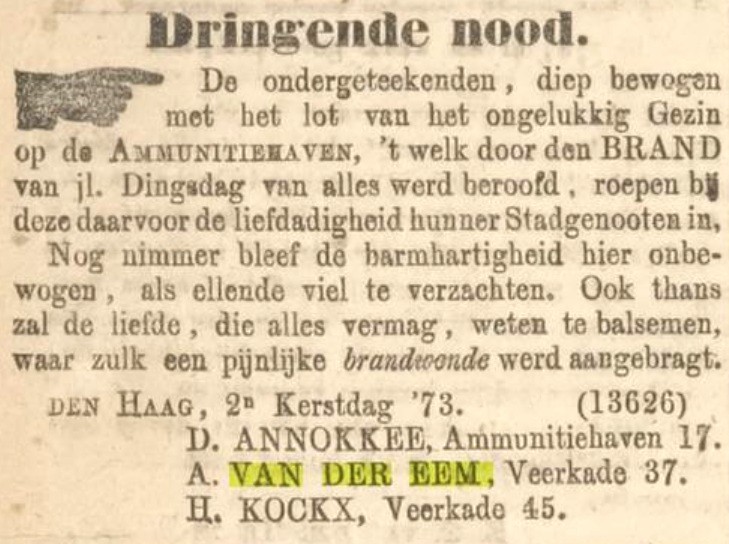 Barend van der Eem is geboren 23-11-1914 te ‘s-Gravenhage, geboorteakte 26-11-1914 's-Gravenhage nummer 6708, gedoopt (onbekend), van beroep huisschilder, werkzaam in het bedrijf van zijn vader, en is overleden 11-12-1952 te ‘s-Gravenhage, overlijdensakte 's-Gravenhage 13-12-1952 nummer 2559. Barend is niet getrouwd. |