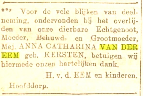 | In de begraafakte van Anna Catharina Garnaat wordt Johannes van der Eem vermeld als Jan van der Eems. |